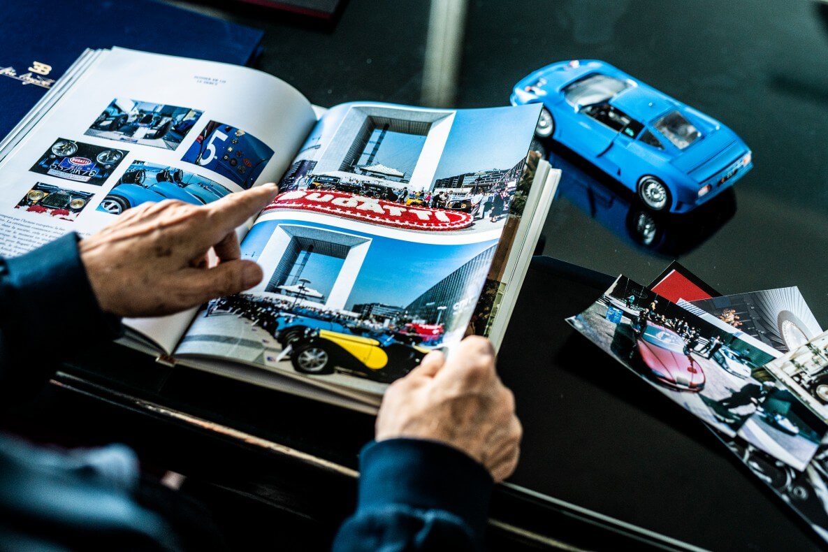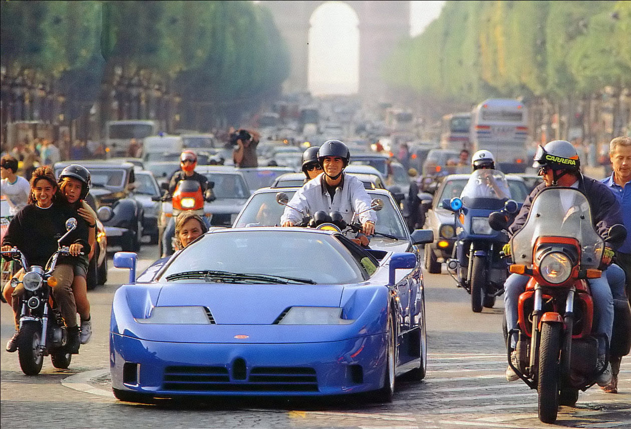 El 15 de septiembre de 1991, hace casi 30 años, con motivo del 110 cumpleaños de Ettore Bugatti, Romano Artioli presentaba en el Salón de París el Bugatti EB 110 en París ante más de 5.000 periodistas y figuras líderes de la industria automotriz de todo el mundo, e innumerables espectadores ansiosos que también tuvieron la oportunidad de asistir al estreno del coche. El evento principal se celebró fuera de las instalaciones habituales del Mondial de l’Automobile y, ante la expectación creada, fueron necesarios varios cientos de policías y vigilantes jurados para salvaguardar la seguridad el evento celebrado en plena Place de la Defense ante una nutrida multitud de aficionados a la marca que chillaban con auténtica locura mientras mientras Alain Delon, popular actor francés, se paseaba con el EB 110 por los Campos Elíseos. Fue la estrella del Salón de París de aquel año y copó las portadas de las grandes revistas del motor de la época en numerosas ocasiones.