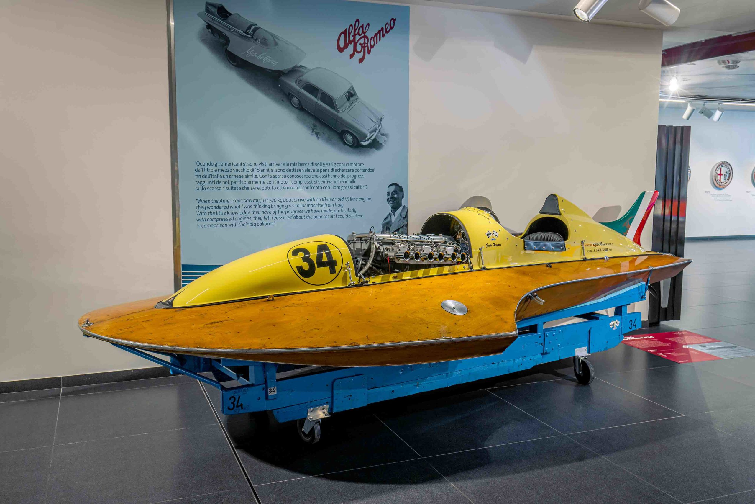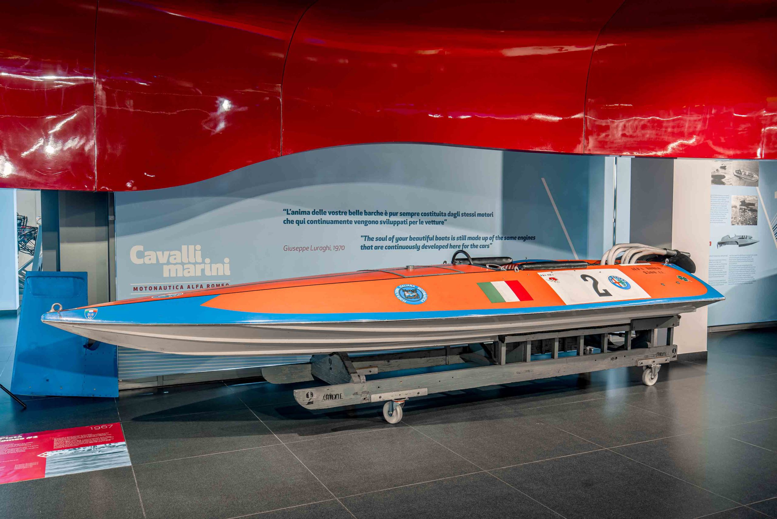 Como marca históricamente ligada al mundo de las carreras, Alfa Romeo tiene un rico palmarés también en motonáutica. Por sí solas, 9 de las 10 embarcaciones de esta exposición (la décima es una embarcación de recreo) pueden enorgullecerse de hasta 11 récords mundiales, 6 campeonatos del mundo, 7 campeonatos europeos y 9 campeonatos italianos, y 5 medallas de oro del Coni (Comité Olímpico Nacional Italiano). La exposición recorre la historia de todos los tipos de motores que dominaron la motonáutica: desde el legendario Alfetta a las diferentes versiones de dos árboles, al Montreal y Tipo 33.