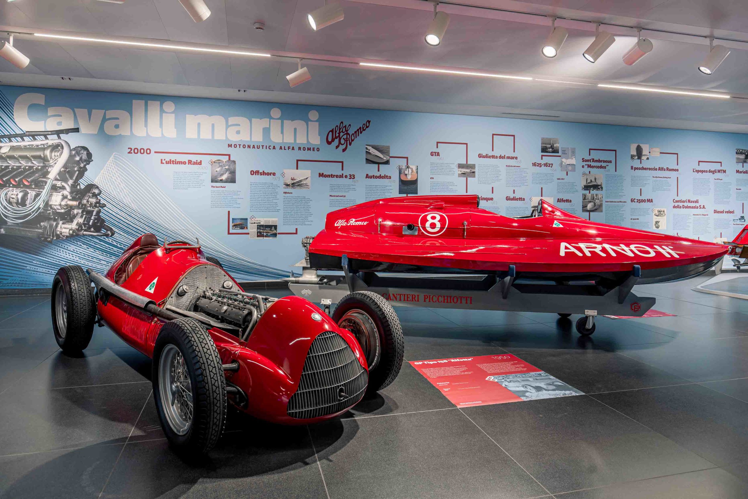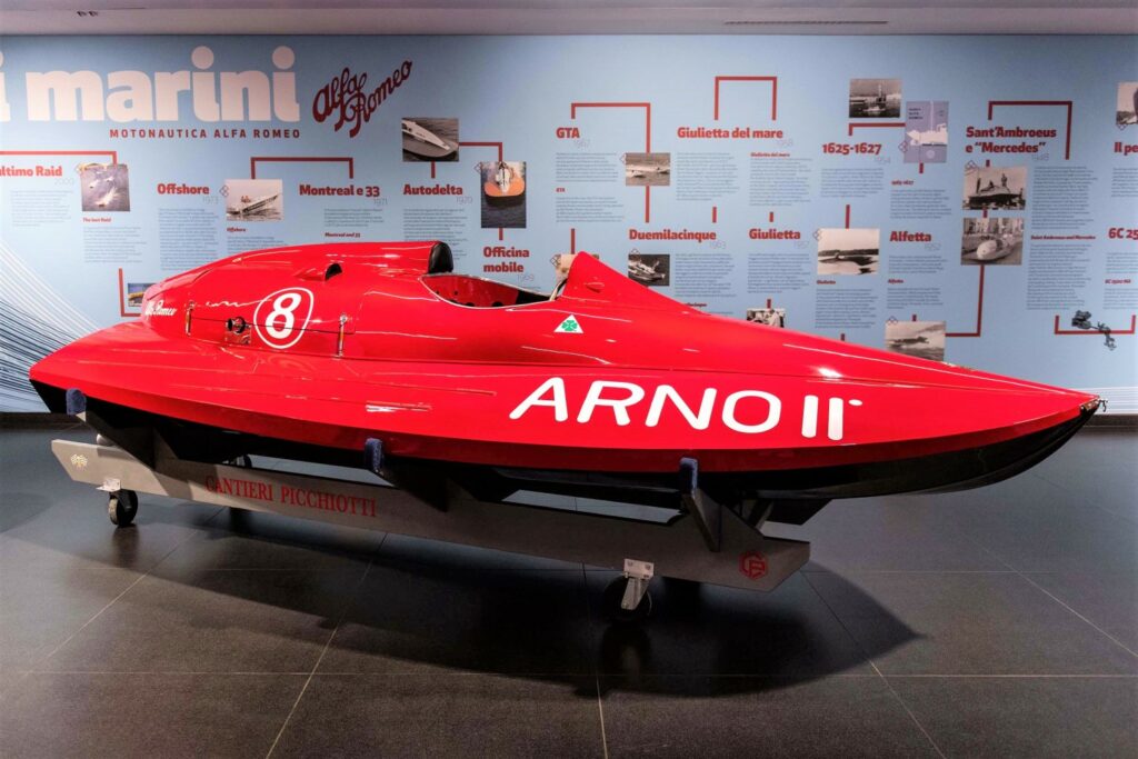 En el campo de la motonáutica, los motores que se adaptaban para un uso marino, a menudo se producían exclusivamente de forma temporal y eran gestionados en los circuitos de carreras directamente por el departamento de carreras de Alfa Romeo. Por ejemplo, este fue el caso de los motores del Alfetta. La exposición es así la ocasión para una reaparición histórica: el encuentro entre Arno II°, una aerodinámica lancha motora construida por los astilleros Picchiotti en Viareggio en 1946 y restaurada específicamente, después de 70 años, para esta exposición, y el motor que la impulsaba en ese momento, originalmente concebido para el Alfetta 158. Un motor que, cuando le brindó a Alfa Romeo su primera victoria de Fórmula 1 de la historia en 1950, ya había ganado tres campeonatos del mundo en el agua, conquistado un título italiano, batido el récord mundial de velocidad y mucho más, con Achille Castoldi como piloto.