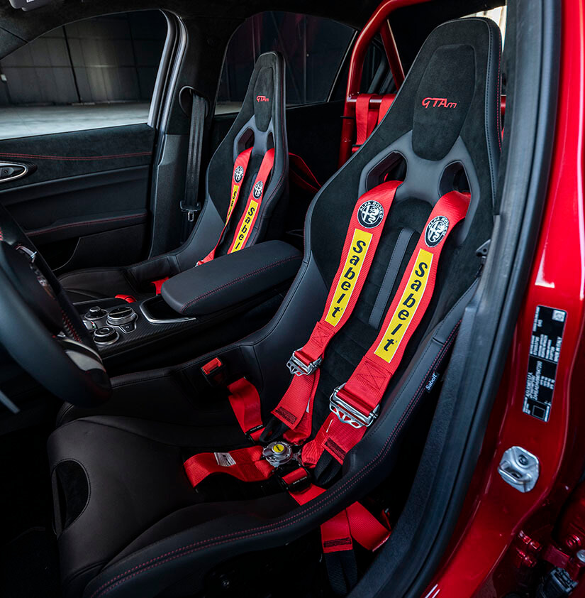 No falta el aluminio en el motor, las puertas y los sistemas de suspensión, junto con varios materiales de composite utilizados para muchos otros componentes: en el GTAm, se ha utilizado un policarbonato para los marcos de las ventanillas laterales y la luneta trasera, lo que contribuye aún más a la reducción de peso. La combinación de un peso más ligero y el aumento de la potencia a 540 CV dan como resultado prestaciones extraordinarias. Cortesía del sistema Launch Mode, sólo son necesarios 3,6 segundos para acelerar de 0 a 100 km/h. A diferencia del GTA, el Giulia GTAm ofrece una configuración biplaza con barra antivuelco trasera, pero sigue estando homologado para su uso en carretera. En el equipamiento GTA, con la misma potencia, el Giulia ofrece cinco plazas: un auténtico superdeportivo también apto para toda la familia.
