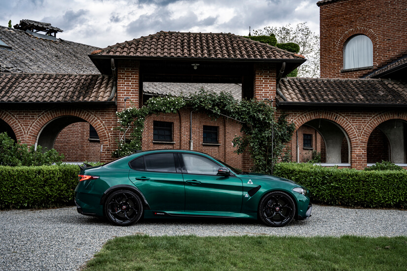 Pero la potencia por sí sola no es suficiente para garantizar unas prestaciones extraordinarias. El trabajo realizado con el fin de reducir el peso del vehículo ha sido minucioso y ha logrado resultados particularmente impresionantes: la reducción de peso total asciende a 100 kg gracias a la adopción de materiales ligeros como la fibra de carbono para el paragolpes delantero, los pasos de rueda delanteros y los asientos deportivos específicos con monocasco de fibra de carbono: cambios adicionales a los elementos ya incluidos en el Giulia Quadrifoglio, como el techo, el capó y el cigüeñal.