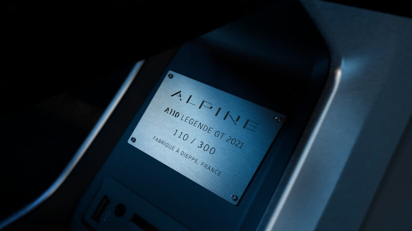 En el interior, ambas cuentan (en sus respectivos acabados), con los exclusivos asientos Alpine Confort Sabelt con seis posibilidades de regulación. Además de los detalles ya mencionados del acabado en ambas versiones, también se perciben otros, como os techos interiores acabados en microfibra Dinámica o los remates en color carbono brillante con trama tejida con hilo cobrizo dispuestos en la consola central, la visera del tablero de a bordo y las bocas de ventilación. El conjunto se remata con las exclusivas alfombrillas de la edición y el reposapiés en aluminio dispuesto en el lado del acompañante. Bajo la consola central, una placa numerada recuerda la pertenencia del coche a la edición limitada, reafirmando la exclusividad del A110 Légende GT 2021.