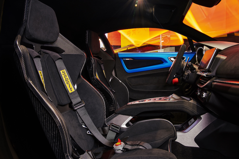 Los asientos monocasco Sabelt Track de A110 R se inspiran también en la competición. Con su diseño único y su construcción en carbono con almohadillas de microfibra y costuras grises, encarnan la deportividad. Equipados con arneses de competición de 6 puntos, estos asientos proporcionan una sujeción óptima para el conductor y el pasajero. El asiento del conductor tiene dos ajustes: longitudinal y en altura. El asiento del pasajero es fijo. La letra « A » bordada en los reposacabezas recuerda la identidad única de este Alpine.