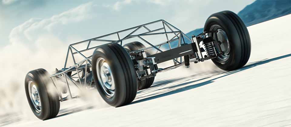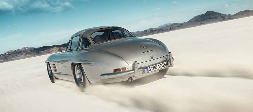 Los impresionantes gráficos que se pueden contemplar en el video se van mostrando a medida que el 300 SL continúa su viaje en la pantalla, con las puertas extendidas actuando a modo de verdaderas alas, atravesando un impresionante cielo azul claro hasta acoplarse de manera cuidadosa sobre su chasis, ya completamente ensamblado, para desarrollar todo su potencial sobre las pistas del desierto.