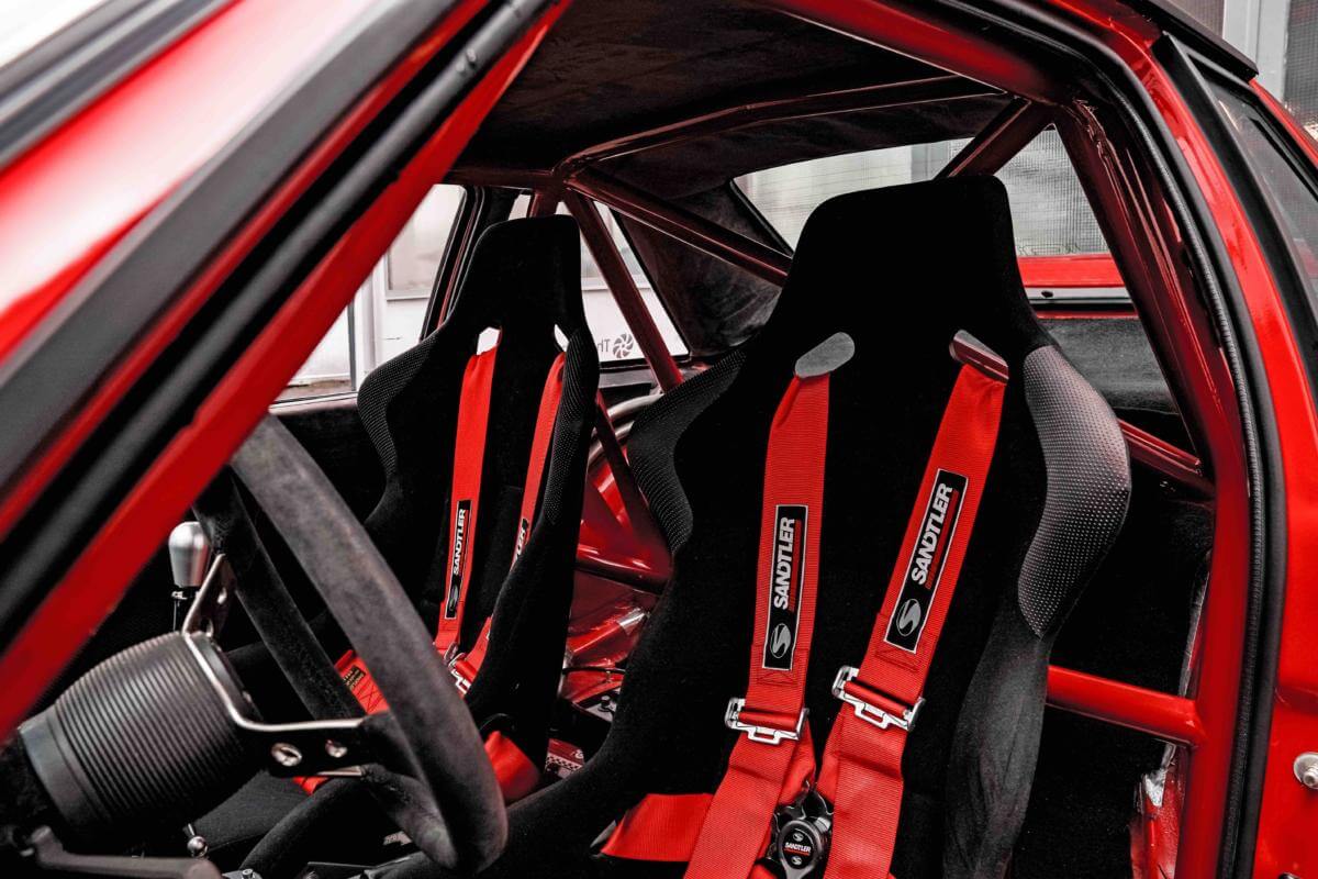 El habitáculo se ha vaciado por completo, dejando básicamente lo imprescindible. Hay dos asientos de competición, con arneses de seis puntos, jaula antivuelco, nuevos paneles de puertas más ligeros, volante desplazado, nueva instrumentación… es casi un coche de carreras pero apto para circular por las vías públicas. Nada extraño, no obstante, pues suele ser una acción habitual en este tipo de preparaciones.