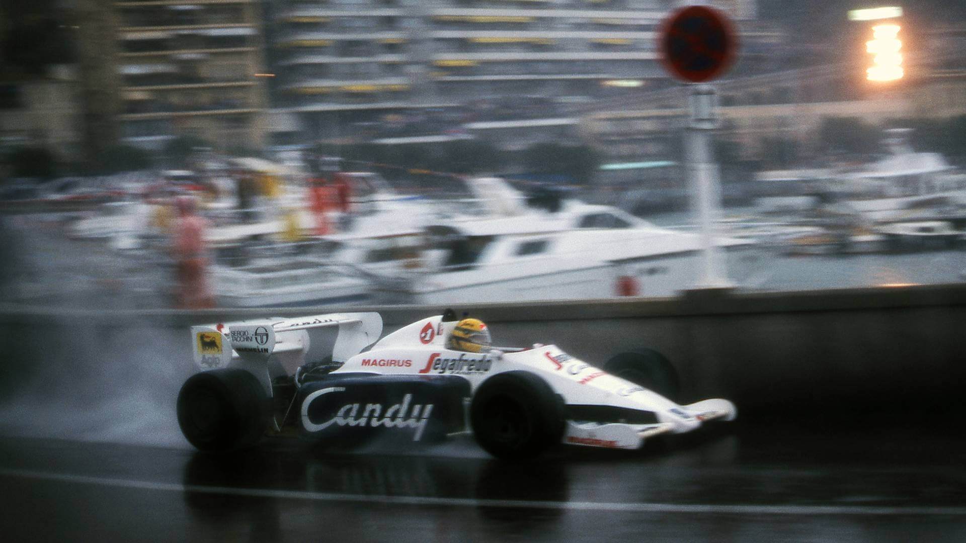 El mismo año de 1984, bajo el diluvio de Mónaco, Senna dio el primer recital de pilotaje en agua remontando muchas posiciones y poniéndose casi a rebufo de Prost con un humilde Toleman. Cuando Senna estaba a punto de superar al francés, este levantó los brazos para que se detuviera la carrera por la fuerte lluvia. La carrera se detuvo, se estableció que la clasificación estaría formada por las posiciones de la última vuelta completa y Senna, finalmente, terminó segundo.