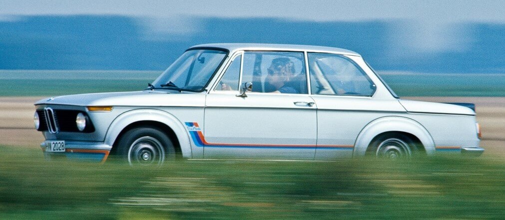 La primera vez que se vio esa palabra en un coche de producción fue en la década de los 70, en el faldón delantero de un pequeño BMW, que además lo tenía escrito de forma que se pudiera leer a la perfección a través del espejo retrovisor (como las ambulancias). Un pequeño BMW que además fue un éxito de ventas en sus versiones normales: el BMW 2002 Turbo.
