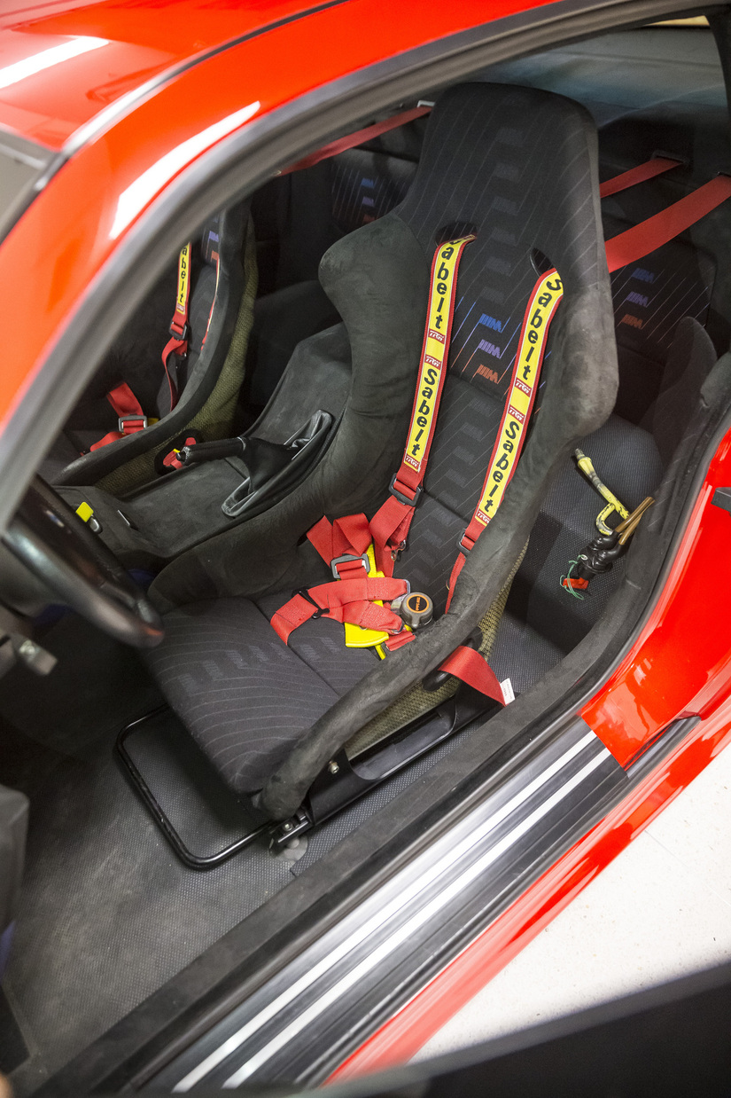 Con respecto al habitáculo, la presencia de ventanillas de Lexan fijas ofrece una idea de lo que se puede encontrar. Se eliminaron los asientos traseros y los delanteros se reemplazaron por dos buckets Recaro. La tapicería era una mezcla de un tejido muy liviano tipo gamuza y Alcantara.