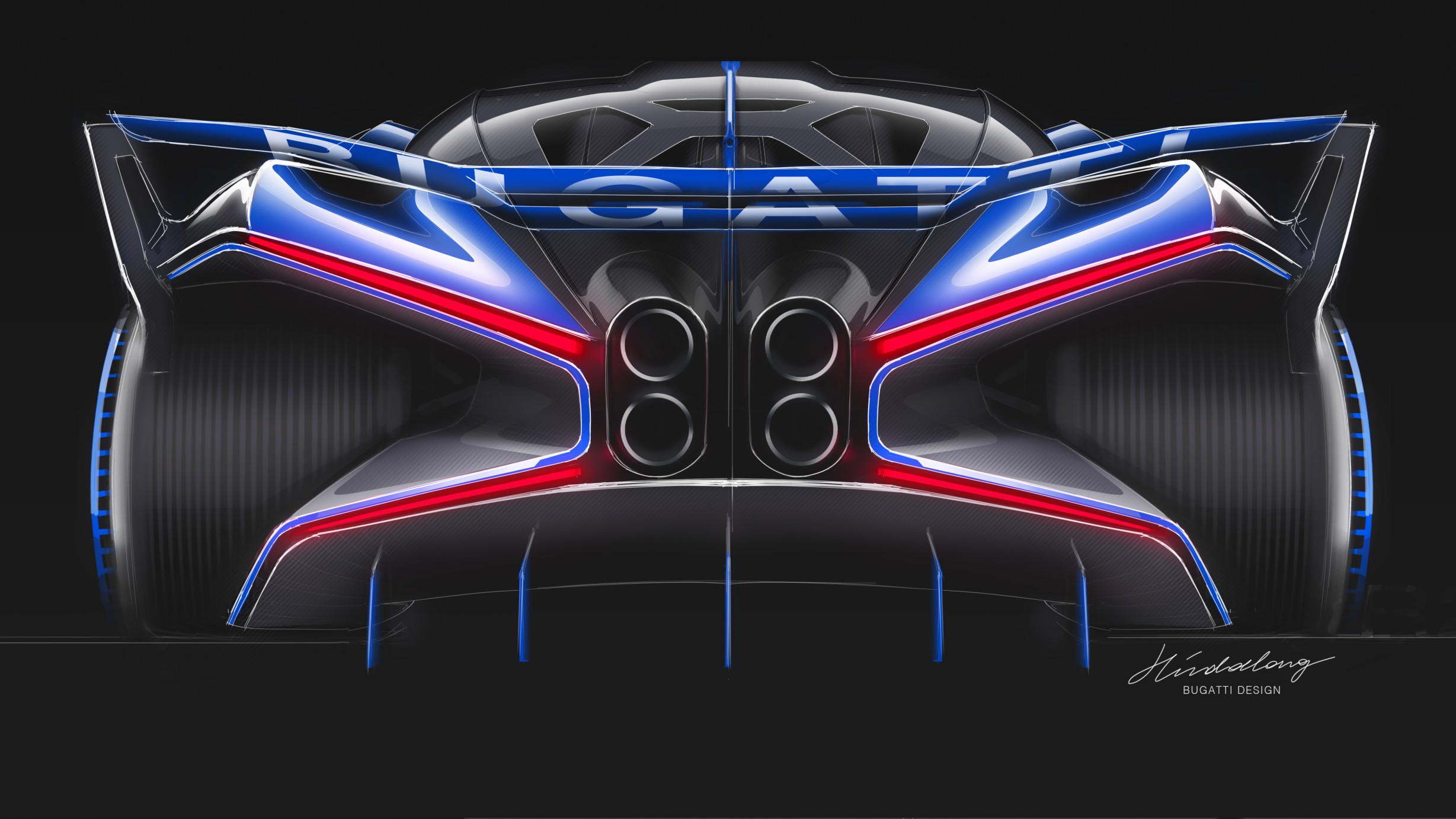 Un detalle ciertamente curioso es el diseño en forma de X de los pilotos traseros del coche, un estética que según ha manifestado la propia Bugatti en la presentación del coche, se inspira en el avión a reacción Bell X-1 de finales de la década de los años 40 del pasado siglo, y que le aporta al vehículo una imagen radical y muy potente. Ese mismo diseño en X se aplica en el frontal del vehículo para las ópticas delanteras, donde igualmente llama la atención su capó, plagado de aperturas aerodinámicas para alcanzar una conducción adecuada de los flujos de aire acorde a los intereses del coche.