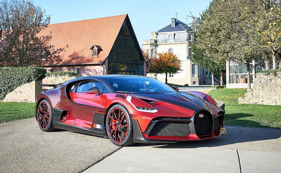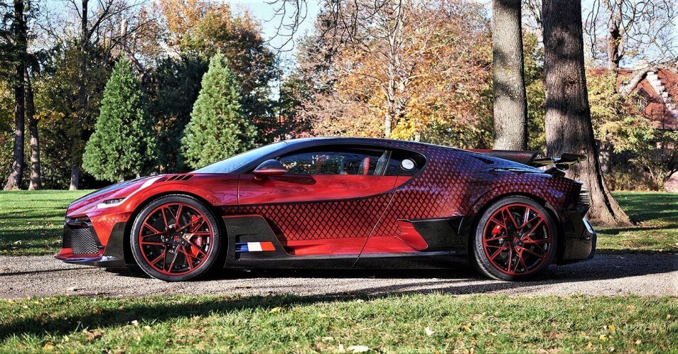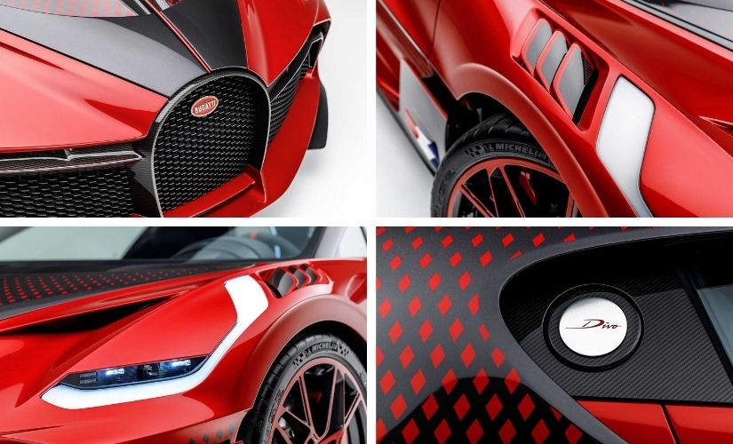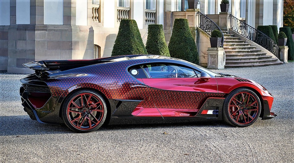 Poco después del estreno mundial del Divo en agosto de 2018, un cliente sugirió la idea de establecer un patrón de desvanecimiento algorítmico geométrico-dinámico en su carrocería. El cliente, un coleccionista de los EE.UU., tenía en mente un patrón geométrico estricto que constaba de formas de diamantes en un contraste de color único. El equipo de diseño y desarrollo de Bugatti se dedicó entonces a desarrollar los colores especiales “Customer Special Red” y “Graphite”, tonos metálicos ambos, para lograr el ansiado efecto de contraste. El patrón de rombos fue diseñado específicamente para avanzar por ambos lados con milimétrica precisión desde la parte delantera del coche hacia la trasera, haciendo juego con la silueta del Divo.