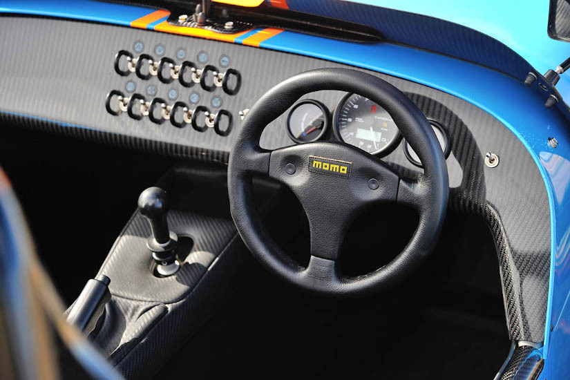 Todo en el Caterham Seven 620R es muy especial. Los asientos apenas tienen mullido y se fabrican con fibra de carbono, el salpicadero también se fabrica con fibra de carbono, las llantas son de magnesio…