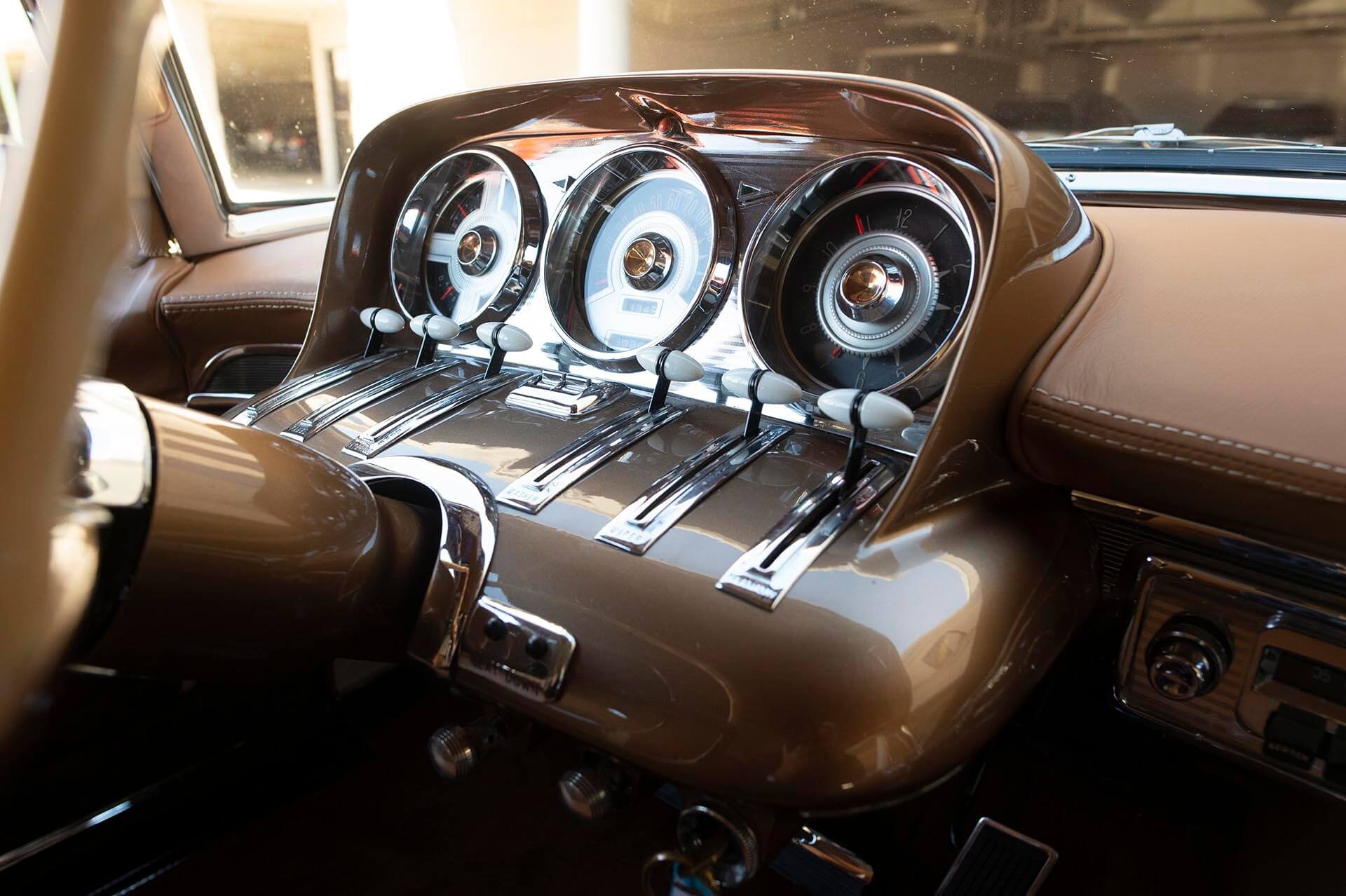 En la década de los 50 y a lo largo de los 60, Estados Unidos vivió un momento de especial creatividad en cuanto a diseño de coches que, pueden gustarte o no, dieron lugar a coches muy característicos e identificables. Por un lado, fue la época de los cromados, un enorme y claro abuso de los cromados que iban desde los paragolpes hasta los marcos de los faros, marcos de las ventanillas, laterales de la carrocería, interiores, adornos en los laterales del techo… eso, sumado también al empleo de aletas puntiagudas y elementos de diseño que se inspiraban en la aeronáutica. Fue la era espacial, todo hacía referencia a los viajes fuera del planeta.