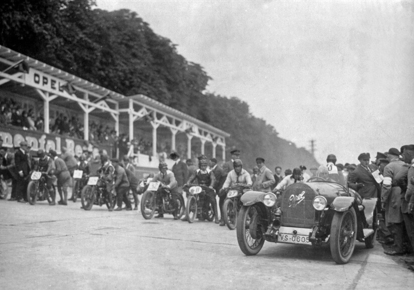 A principios de los años 20, el Opel Rennbahn era conocido como el circuito de competición más rápido de Europa. Situado a unos pocos kilómetros al sur de Rüsselsheim, el trazado, de 1,5 km, era estrecho y con un peralte muy pronunciado. Las medidas de seguridad eran prácticamente inexistentes. A diferencia de los circuitos modernos, no había barreras de protección, ni puzolanas, zonas de grava, ni amplias escapatorias para detener o decelerar los coches en caso de que se salieran de la pista. Los espectadores se congregaban completamente desprotegidos al borde de la pista. Hoy es posible experimentar algunas de las emociones de las carreras de aquella época gracias a un vídeo publicado recientemente en YouTube: