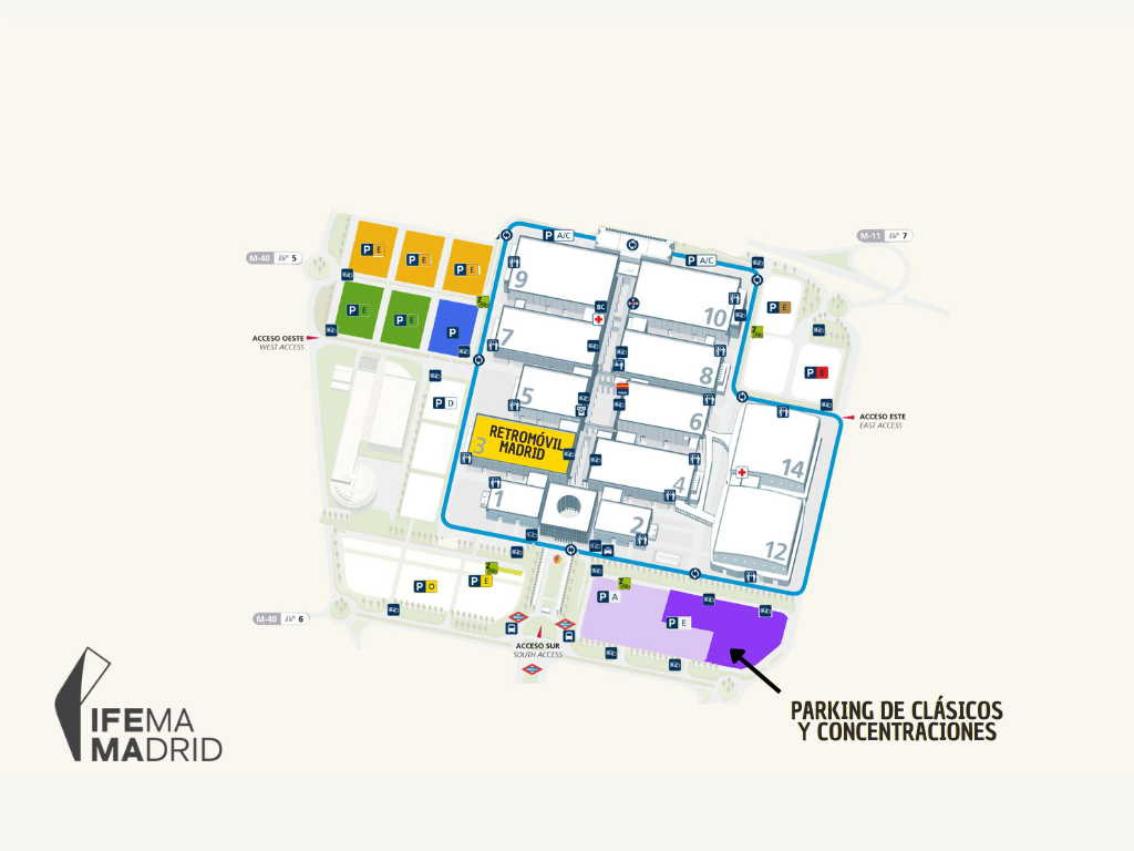 Para llegar a Retromóvil Madrid dirígete al acceso SUR de IFEMA. Una vez allí sigue las indicaciones para llegar al parking Violeta, que es el que estará reservado para los clásicos.