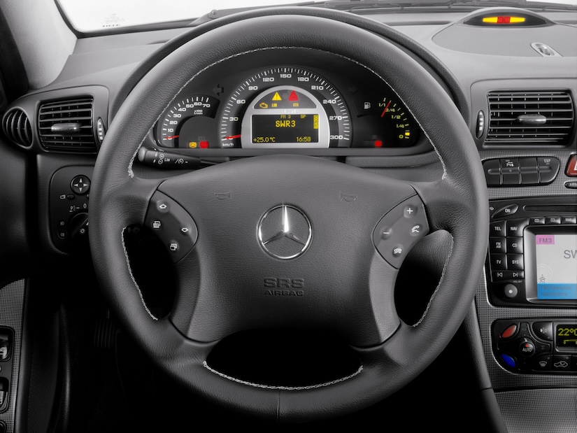 Esa tendencia se podía apreciar claramente en su interior, donde apenas había detalles que dejaran nota lo especial que era el C32 AMG. El volante, por ejemplo, mantenía el diseño de todo Mercedes, con cuatro radios y aro grueso. Los pedales tampoco cambiaban, como tampoco lo hacía la decoración general, salvo una nueva plancha para la consola central. La tapicería, los asientos… en general, el interior del Mercedes C32 AMG no daba ninguna pista sobre su potencial, aunque sí daba pistas sobre su calidad.