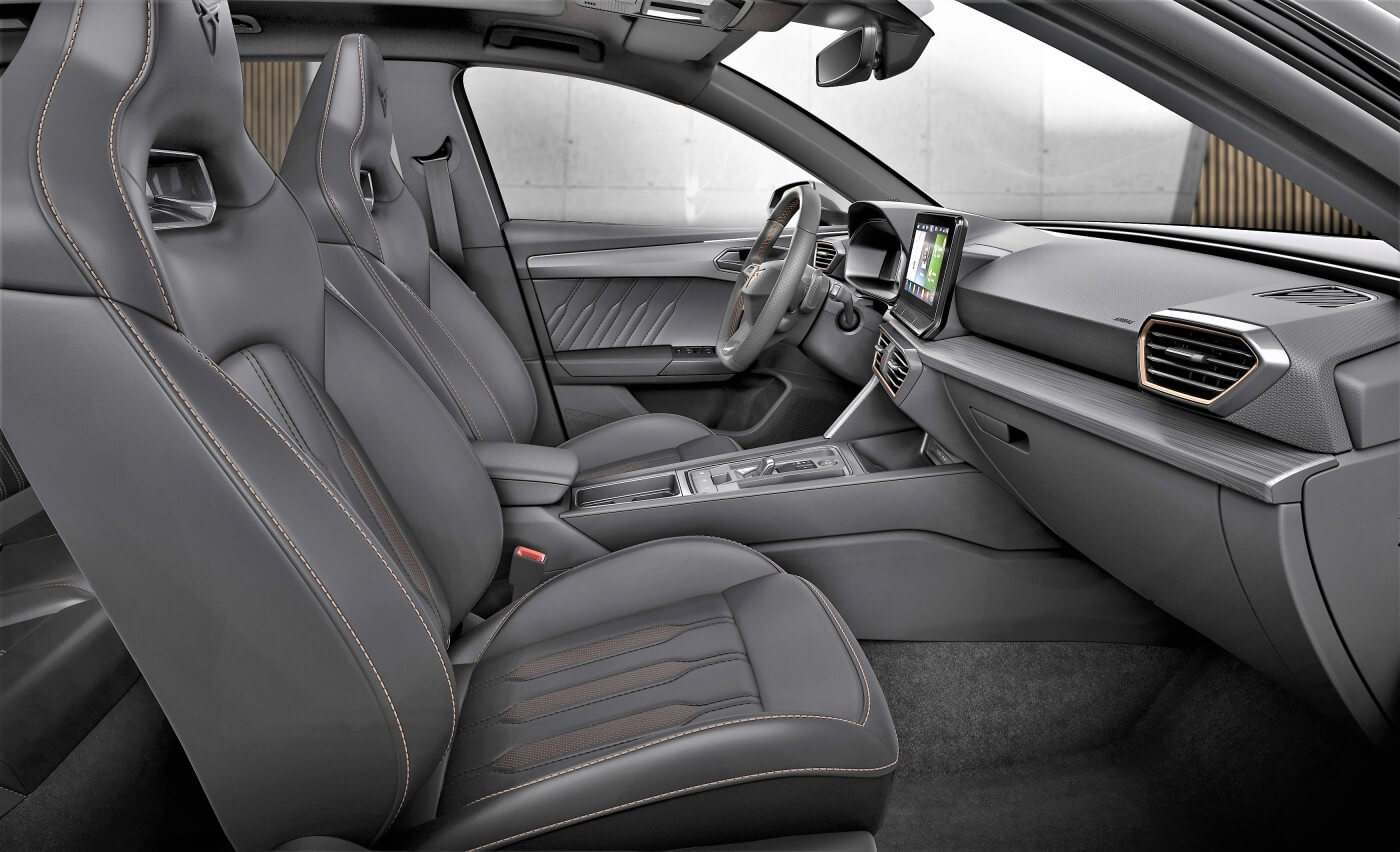 Para completar una oferta atractiva que permita a ambas versiones situarse como la referencia deportiva en el segmento de los compactos, Cupra las ha dotado de serie con un equipamiento de lo más completo en el que se incluyen interesante elementos, como por ejemplo los asiento deportivos tipo bucket con las costuras vistas en color Copper, volante deportivo calefactable con levas añadidas para el cambio (opcionalmente se le pueden incorporar botones satélite para el arranque del motor y la selección de los modos de conducción), pedalier en aluminio cepillado y una gama de 5 atractivos diseños diferentes entre los cuales elegir para las llantas de aleación de 19 “ que montan los nuevos Cupra León.