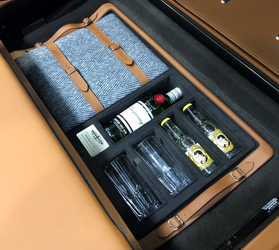 Otro de los detalles exclusivos de Speedback GT es el juego de bebidas que se esconde en la amplia columna central dispuesta entre las dos plazas traseras, a las que se accede abatiendo los asientos delanteros. Junto a la Ginebra favorita del propietario y al doble servicio de vasos y refrescos de agua tónica se incluye también una manta de picnic elaborada en lana virgen de primera calidad para arroparse y disfrutar del espectacular asiento de picnic que se oculta bajo el suelo del departamento de equipajes en la parte posterior del coche. El largo portón del maletero protege a los usuarios del mismo tanto de la lluvia como de cualquier objeto que pudiera caerles encima. El asiento se extiende más allá del maletero. El pack de picnic es uno de los elementos característicos del SpeedBack GT, así como uno al que los propietarios del coche dedican más tiempo durante el desarrollo de la personalización del coche.