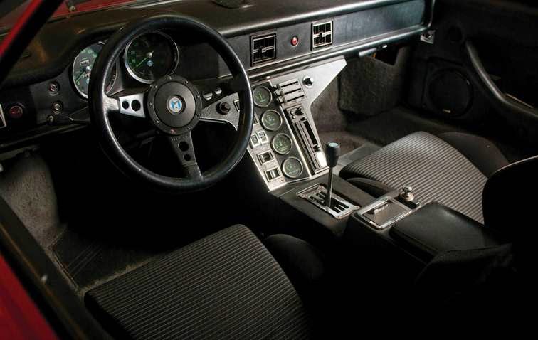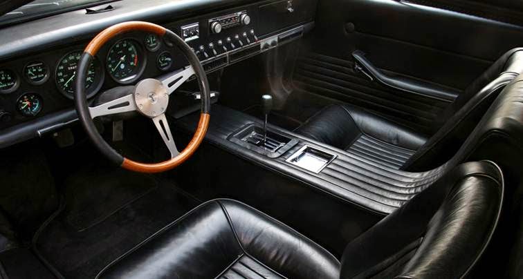 Interior de un De Tomaso Longchamp, modelo 1974, nótese el volante de Ford