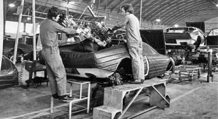 Fotografía tomada en 1973, en la línea de ensamblaje de un De Tomaso Pantera