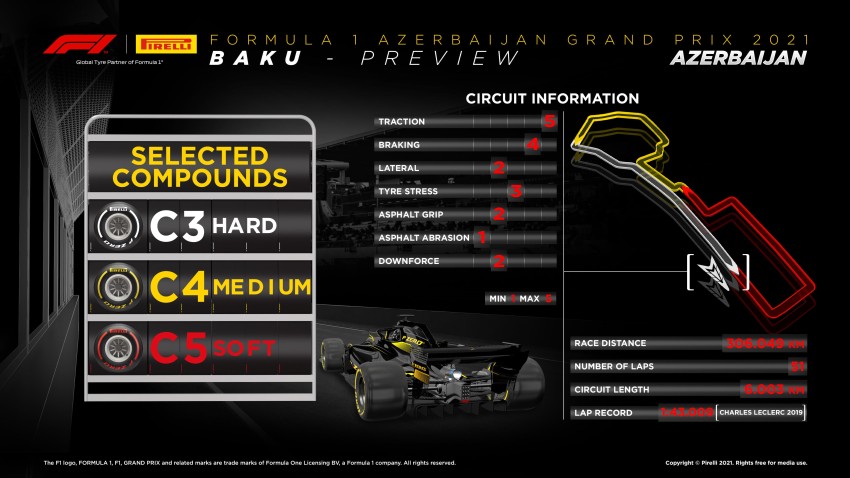 El proveedor oficial de neumáticos de la Fórmula 1, Pirelli, utilizará una vez más la gama de neumáticos más blanda: C3, C4 y C5. El circuito urbano de Bakú es completamente diferente al de Mónaco, aunque comparten la característica de ser muy poco abrasivas. Esto favorece a que se utilicen los mismos compuestos.