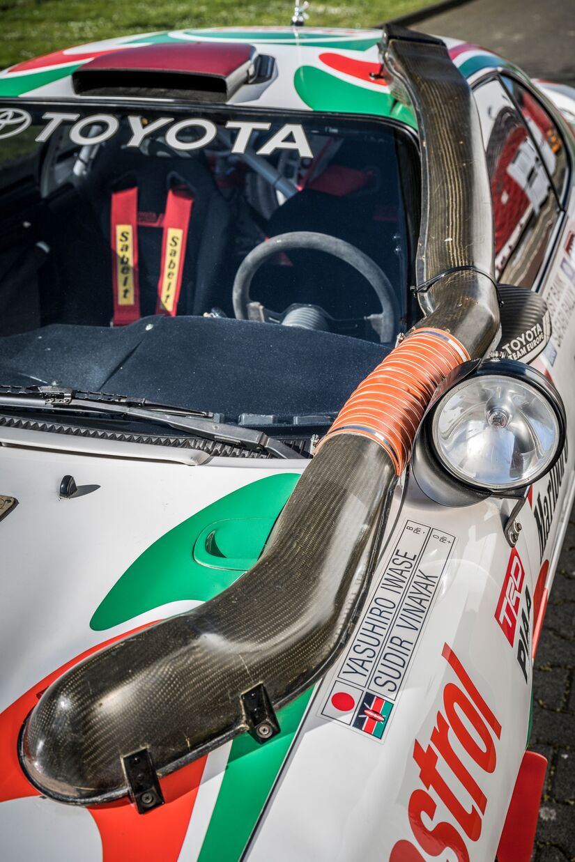 Con su inconfundible esnórquel para que llegue aire al motor incluso si está bajo el agua, unos faros montados en el parabrisas a suficiente altura para esquivar la mayor parte del barro que salte y unas barras protectoras frontales por si acaso se cruza algún animal salvaje, el Celica, de 299 CV y 1100 kg, es todo un dominador del Rally Safari, aunque con mucho cariño ha recuperado su mejor aspecto.