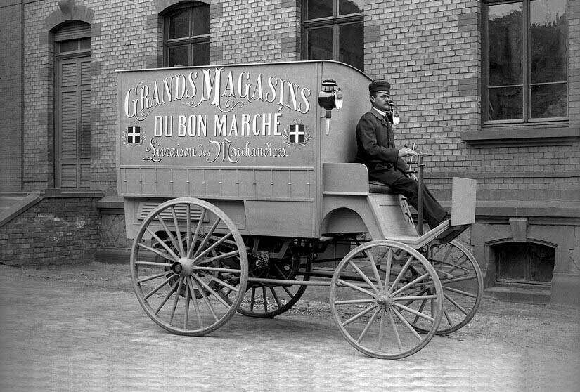 El conductor y el área de carga estaban casi al mismo nivel, pero esto no fue obvio a primera vista. Esto se debe a que el vehículo tenía la forma de una furgoneta, con un espléndido anuncio de los grandes almacenes y el propósito de este vehículo importado de Alemania en los paneles laterales: “Grands Magasins Du Bon Marché. Livraison des Marchandises ”. («Grandes almacenes Du Bon Marché. Entrega de mercancías»). El cliente estaba haciendo lo que el fabricante había recomendado en el catálogo de 1896, donde Benz & Cie. enfatizaba el potencial impacto publicitario de la furgoneta: “Gran publicidad para cualquier importante negocio”, sugería el folleto.