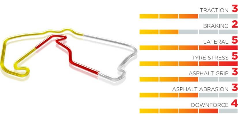 Silverstone es conocido como un circuito de alta velocidad y alta intensidad. Las famosas curvas de Maggots y Becketts, en particular, imponen grandes fuerzas sobre los neumáticos, causadas por un pico de aceleración lateral superior a 5 g cuando los pilotos transitan a gran velocidad. Asimismo, grandes velocidades punta se alcanzan en las rectas Wellington y del Hangar.