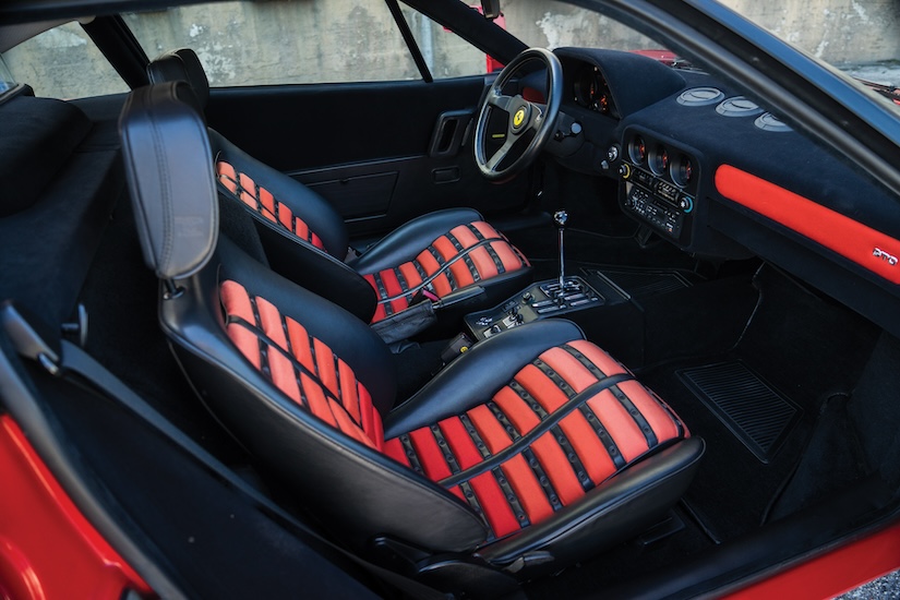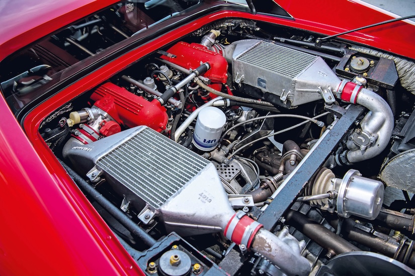 La Fórmula 1 también se dejaba notar en el propulsor, pues empleaba los desarrollos que se habían creado para el ya mencionado 126 CK, que además de ser el primer F1 de Ferrari con carrocería de composite, también era el primer F1 con motor turbo del Cavallino Rampante. Hablamos de un V8 biturbo –dos turbocompresores IHI–, que añadían potencia bruta a los 2.855 centímetros cúbicos que desplazaban sus ocho cilindros. Las culatas tenían cuatro válvulas por cilindro y dos árboles de levas cada una, había dos intercambiadores de calor –dos intercoolers– y una inyección Weber-Marelli IAW, todo ello pensado par extraer 400 CV a 7.000 revoluciones, que llegaban a las ruedas traseras, sin ningún tipo de filtro electrónico –no había control de tracción, ni ABS, ni reparto de par vectorial… – mediante una caja de cambios manual de cinco relaciones y un diferencial de deslizamiento limitado mecánico. Suficiente para presumir de una velocidad punta de 305 km/h.