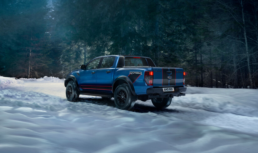 Con una selección de atrevidos acabados exteriores en color Azul Performance, Gris Conquista y Blanco Frozen, el nuevo Ranger Raptor Special Edition añade dos franjas de competición en negro mate (con líneas de contraste rojas) en el capó, el techo, los laterales inferiores de la carrocería, las aletas traseras y el portón trasero para enfatizar aún más el carácter de alto rendimiento del pickup.
