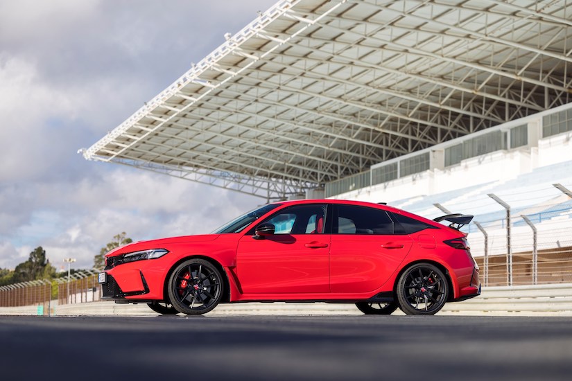 El Civic Type R es 8 mm más bajo y 90 mm más ancho que el Civic e:HEV, y 13 mm más bajo y 15 mm más ancho que la generación anterior del Civic Type R. El perfil bajo y el aspecto musculoso se han conseguido por medio de unos pasos de rueda esculpidos y robustos que se ensanchan sobre unas llantas de aleación de 19 pulgadas en color negro, ligeras y de gran rigidez. Estas llantas exclusivas del Type R montan unos neumáticos Michelin Pilot Sport 4S 265/30 R19 de compuesto específico.