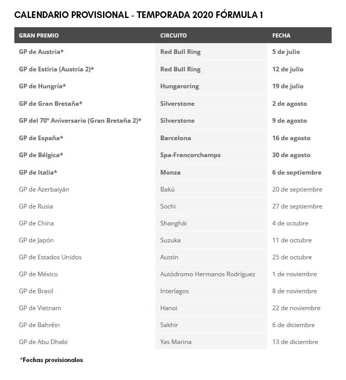 De esta forma, el mundial se iniciará en el austriaco circuito Red Bull Ring el 5 de julio con el GP de Austria, dando paso a la segunda cita en el mismo trazado el fin de semana siguiente, el 12 de julio. A estas dos carreras, les seguirán las pruebas de Hungría el 19 de julio, Gran Bretaña con doble cita los fines de semana del 2 y 9 de agosto, España el 16 de agosto, Bélgica el 30 de agosto e Italia el 6 de septiembre. Estas serán las 8 primeras pruebas de un total de 18, que pretende realizar la organización en este 2020.