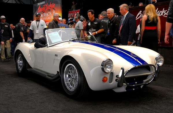 1964 Shelby Cobra 289 Roadster. CSX2281 Carrocería de aleación. Restaurado en el color correcto Blanco Wimbledon con rayas azules LeMans, barra anti-vuelco cromada y rines de radios de acero . Subastado en 2010 por 478.500 $