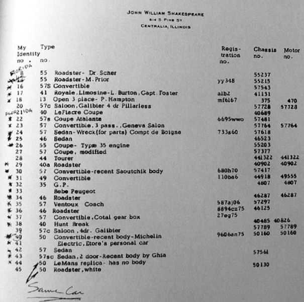 Esta es el inventario de los coches tal y como los describió Bob Shaw cuando hizo el primer contacto con los hermanos Schlumpf en 1963, todos los de esta lista se negociaron: