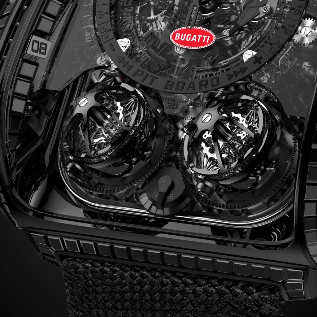 Como aquellos, el reloj captura su espíritu para asociarse aún más vinculando la gran complicación de los relojes Twin Turbo Furious Bugatti La Montre Noire con la tradición y la historia única de La Voiture Noire1. El resultado de todo ello es el dinámico y extremadamente cómodo de llevar TwinTurbo Furious Bugatti La Montre Noire, un reloj que refleja a la perfección los elevados estándares de rendimiento y excelencia que preconiza una marca como Bugatti, al tiempo que ofrece la amplia versatilidad de uso por la cual la marca francésa es mundialmente reconocida.