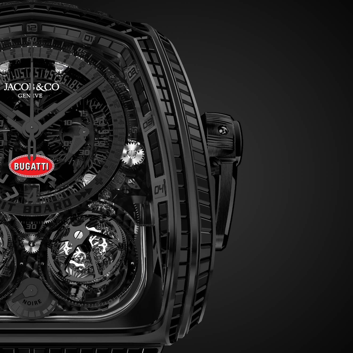La caja de oro negro de 18 quilates del reloj está engastada de forma invisible con 344 zafiros negros naturales. Incluso la hebilla desplegable, elaborada en oro negro y titanio en el mismo color, está igualmente engastada con estas hermosas piedras preciosas. Situar los zafiros negros en la caja de diseño ergonómico es una tarea sumamente compleja incluso para los más reputados maestros y expertos en gemas de Jacob & Co, pero el resultado de semejante esfuerzo sencillamente ha merecido las muchas horas de dedicación empleada en tal empeño. Los resplandecientes fragmentos del cielo nocturno acentúan aún más el homenaje que esta joya única de la relojería realiza a uno de los mayores misterios automotrices que aún perduran en nuestros tiempos.