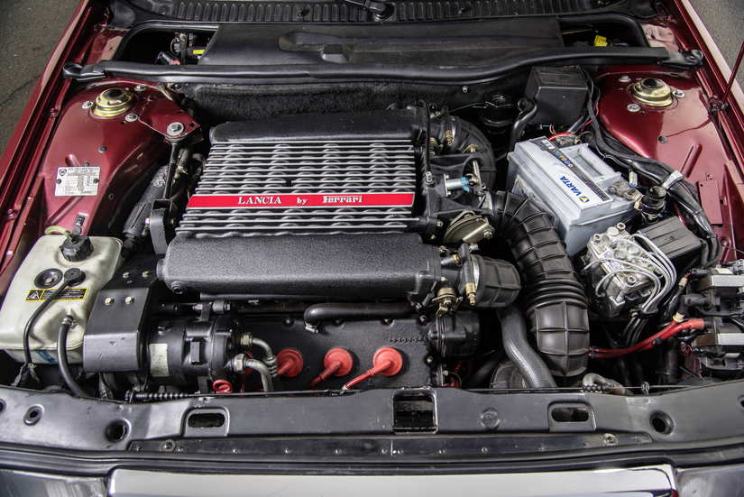 Hablamos de un motor de 2.927 centímetros cúbicos con culatas de cuatro válvulas por cilindro –la denominación “8.32” era por el número de cilindros y el número de válvulas–, alimentación mediante inyección electrónica y una potencia de 255 CV. Era un motor pensado para un automóvil deportivo, para una berlinetta, así que los ingenieros de Lancia adaptaron el motor a las pretensiones del coche. Por ejemplo, se cambio el cigüeñal plano por uno convencional –el calado de las muñequillas pasó de 180 a 90º–, se cambiaron las válvulas por unas un poco más pequeñas, se cambió el orden de encendido y la inyección Microplex de Magneti Marelli dejó su lugar a un sistema Bosch KE3 Jetronic. El resultado fue que se pasó de 255 a 215 CV a 6.750 revoluciones y de 263 a 285 Nm de par a 4.500 revoluciones. Además, el motor no entraba en el vano motor y hubo que modificar los soportes y la bomba del agua, que era específica para los Thema 8.32.