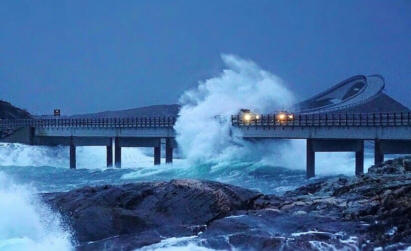 Su nombre significa “carretera del Atlántico”. Esta sección de la Carretera Nacional 64, con sus escasos 8 kilómetros, es una de las infraestructuras más fascinantes del mundo. Conecta las poblaciones de Averøy y Eide, y en su sinuoso recorrido a través de los fiordos del mar de Noruega, en el gélido Atlántico Norte, atraviesa diversas penínsulas, islas e islotes. El tramo lo forman varias calzadas, viaductos y puentes, entre los que sobresale el de Storseisundet. Su trazado curvilíneo, similar al de una serpiente que se retuerce en un escorzo casi imposible, lo convierte en una auténtica obra de arte. Enmarcado, además, en un paisaje que corta la respiración, con el mar, los fiordos y las montañas nubosas alrededor, al conducir por esta ruta es difícil no sentirse golpeado por el síndrome de Stendhal. La longitud total del tramo es de 8,274 kilómetros. La carretera tiene una vista al mar abierto, lo cual es raro en las carreteras a lo largo de la costa noruega. Se pueden ver los fiordos y las montañas cercanas a la carretera.