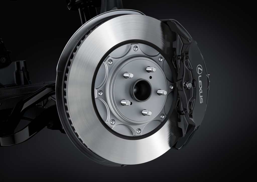 En el sistema de frenado se han colocado unas pastillas de freno de mayor tamaño y superior coeficiente de fricción. Con ellas, el coupé ofrece una frenada más eficaz y estable, especialmente al circular a gran velocidad cuando estas se ven afectadas por el calor. Se mantienen los discos ventilados tanto en el eje anterior como en el posterior y las pinzas monobloque de aluminio con seis pistones opuestos en el eje delantero y cuatro en el trasero. Las pinzas están acabas en color negro con el logotipo de Lexus en color blanco. En el interior del coche, la dimensión de la superficie del pedal del freno se ha revisado para ofrecer una mayor área de contacto con el pie del conductor y que este perciba mejores sensaciones al hacer uso de los frenos del coche.