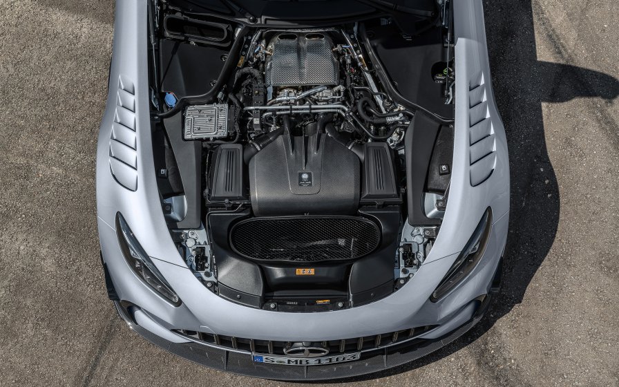 Al igual que el modelo más potente del AMG GT Coupé de cuatro puertas, los dos turbocompresores de doble entrada se apoyan sobre rodamientos con el fin de optimizar su respuesta. No obstante, la rueda del compresor en los turbocompresores del Black Series es de mayor tamaño, de modo que los dos grupos de sobrealimentación pueden transportar conjuntamente hasta 1.100 kg de aire por hora. A título comparativo: en el AMG GT R son 900 kg/h. No se considera crítico un régimen permanente de 7.000 rpm. A partir de 7.200 rpm se limita el número de revoluciones. Y los dos intercoolers de mayor tamaño garantizan que la temperatura del aire de sobrealimentación se mantenga siempre en un nivel óptimo. La placa colocada sobre el motor, de color negro, es un testimonio más de la condición excepcional del propulsor.