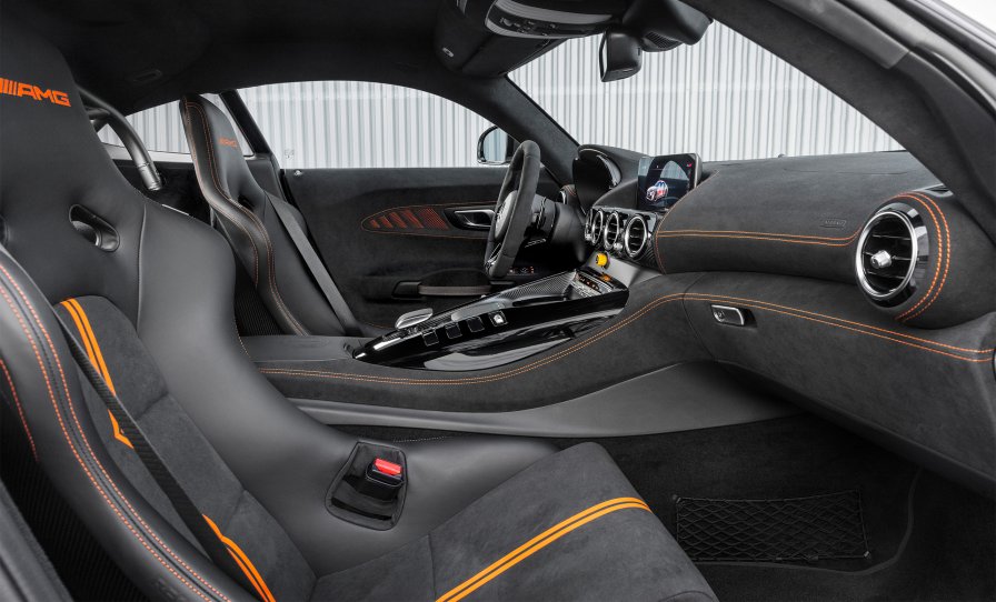El concepto interior subraya la posición destacada del AMG GT Black Series. El cuero exclusivo napa se combina con la deportiva microfibra DINAMICA en color negro y con costuras de adorno en color de contraste naranja. El portainstrumentos y los paneles de las puertas de construcción ligera y nuevo diseño —en lugar de asideros equipan ahora tiradores de lazo—, están revestidos con microfibra DINAMICA en negro. Costuras adicionales en color de contraste naranja, elementos de adorno en fibra de carbono negro mate y el paquete AMG Night interior añaden también toques llamativos. Los asientos AMG tipo «baquet» de fibra de carbono (no disponibles para EE.UU., Canadá y China) combinan un peso reducido con una sujeción lateral óptima. En EE.UU., Canadá y China, el Black Series va equipado de serie con asientos AMG Performance. El interior está disponible también como opción con costuras de adorno en color de contraste gris.
