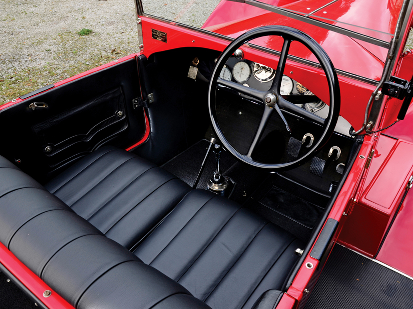 Detalle del interior del Lancia Lambda con la palanca de cambios entre los dos asientos