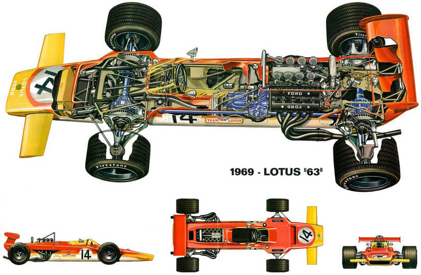 En 1969, el equipo creó el Lotus 63, un monoplaza con el que intentaron revolucionar la Fórmula 1. ¿Cómo? con un sistema de tracción a las cuatro ruedas (4WD). No iban a ser los primeros en la F1 ni tampoco los únicos en aquella temporada en experimentar con la tracción integral, pero sí de quienes se tenía mayores expectativas debido a la capacidad del equipo y a que ya habían trabajado con este tipo de coches.