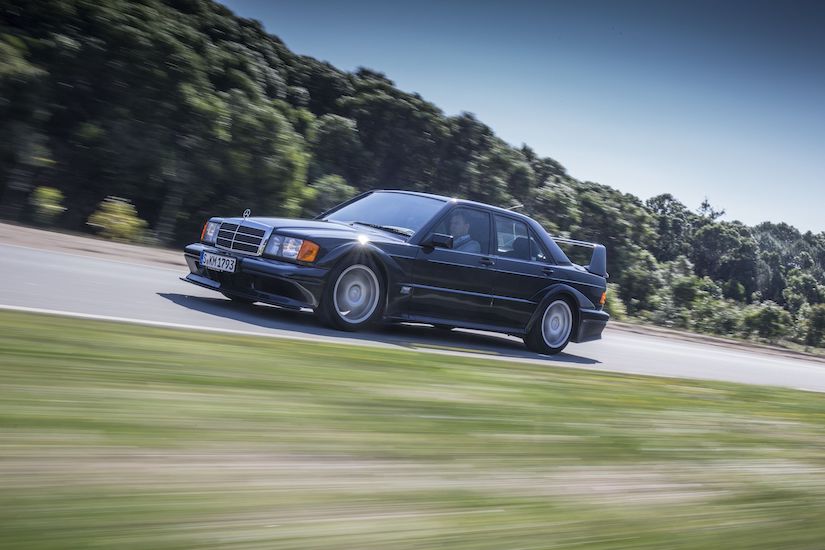 Nos referimos al Mercedes 190E 2.5-16 EVO, un coche que ya a simple vista deja entrever que no es un Mercedes normal y corriente. Para su imagen, aunque se partió igualmente del 2.5-16 estándar, los diseñadores e ingenieros se basaron en las necesidades que habría en competición. Por eso, apareció un alerón sobre el maletero de mayo tamaño, el paragolpes cambio sus formas y se llenó de aberturas –necesarias para refrigeración de motor y frenos–, se ensancharon las aletas de forma notable para acoger nuevas ruedas… el aspecto del 190E 2.5-16 era espectacular, a juego con lo que había escondido en su interior.
