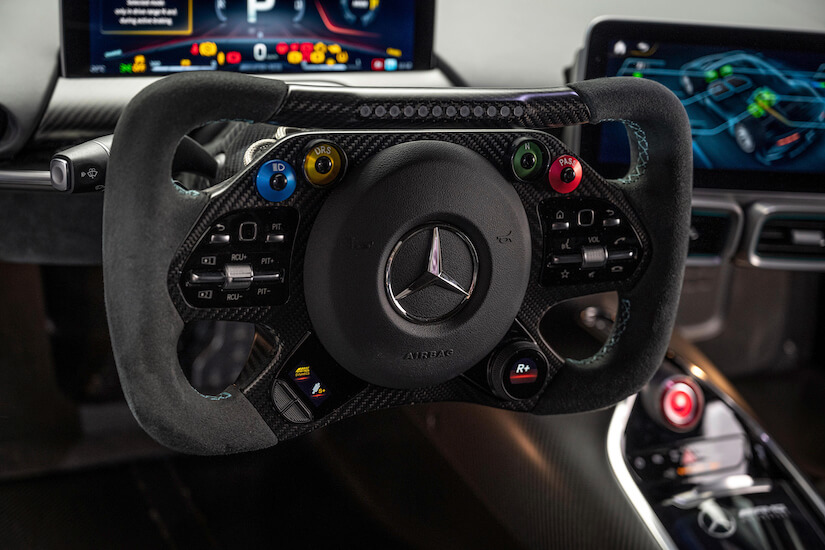 En el volante de competición de alta calidad, con un diseño radical, se combinan los elementos de manejo y funcionales con componentes originales del mundo de la competición para garantizar un manejo seguro en situaciones extremas de conducción. El indicador de cambio de marcha se muestra en la parte superior del aro del volante, como es habitual en los vehículos de competición. El volante con sección superior e inferior plana y airbag integrado muestra otros elementos del mundo del automovilismo. Las dos teclas AMG integradas en el volante facilitan la activación de diferentes funciones sin necesidad de separar las manos del volante. Por ejemplo, los programas de conducción, el AMG Traction Control con nueve niveles, la activación del DRS o los ajustes del tren de rodaje.