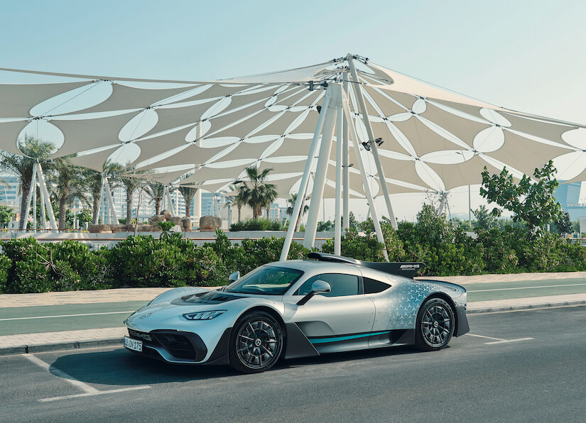 El singular Hypercar no entusiasma solamente por su equipo de propulsión híbrido E PERFORMANCE, procedente de la Fórmula 1, sino también por otros equipos tecnológicos asumidos del deporte del motor. El elenco se extiende desde el monocasco de fibra de carbono y la carrocería de fibra de carbono, pasando por la unidad motor/cambio con funciones portantes y los componentes aerodinámicos activos, hasta el tren de rodaje «Push rod» con varillas de empuje. Gracias a su compleja tecnología, el biplaza Mercedes-AMG ONE ofrece atributos y funciones que superan a los de un bólido de Fórmula 1. Entre otros, dispone de la tracción integral completamente variable AMG Performance 4MATIC+ con eje trasero de propulsión híbrida, eje delantero de propulsión eléctrica y Torque Vectoring. Además, puede circular en régimen exclusivamente eléctrico.