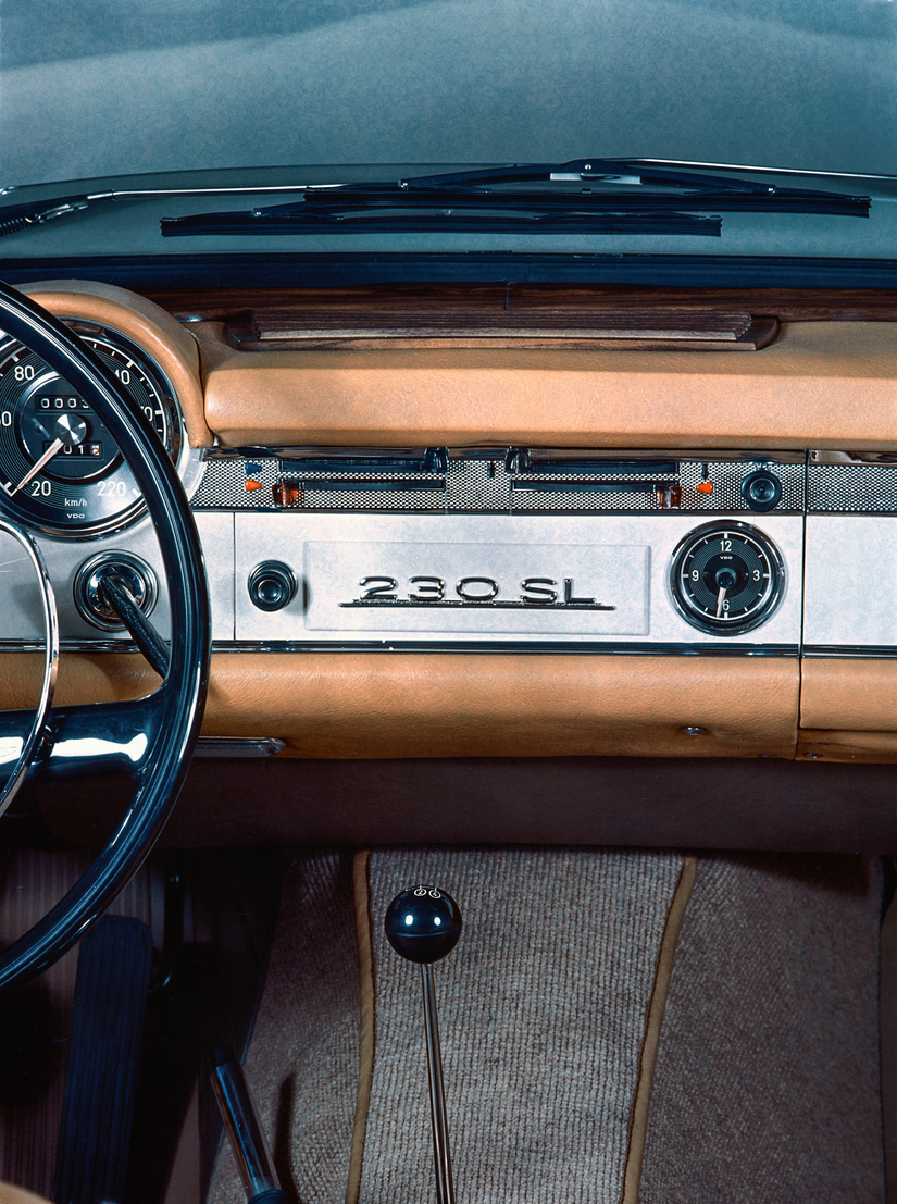 En 1963, el 230 SL impresionó como un confortable turismo biplaza de altas prestaciones. Su diseño se creó bajo la dirección de Friedrich Geiger. Combinaba líneas limpias con el aspecto clásico del SL, incluida una gran estrella central en la parrilla del radiador. El techo rígido opcional evocaba una asociación: Su superficie de techo curvada hacia dentro recordaba a los templos asiáticos. Esto dio al deportivo el sobrenombre de «Pagoda». Paul Bracq diseñó el techo desmontable del coupé.