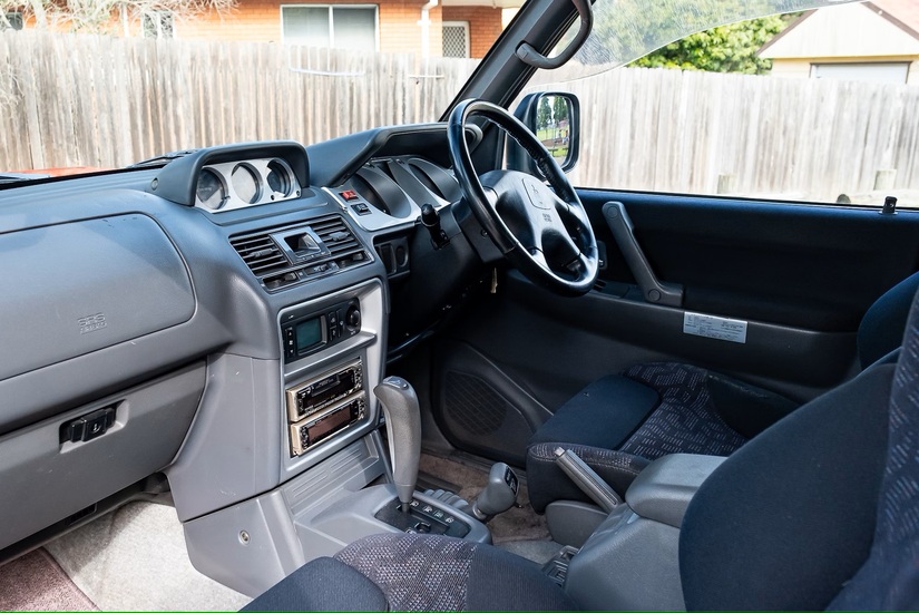 Tan solo hace falta ver su estampa para comenzar a sospechar que se trata de un coche especial. Carrocería ancha, ruedas, alturas con respecto al suelo, entradas de aire… es imponente y desde luego, deportivo, muy deportivo, aunque su habitáculo, como suele ocurrir en ocasiones –sobre todo con fabricantes japoneses–, era muy estándar, tanto, que apenas se diferenciaba de cualquier otro Pajero de la época por unos pedales especiales y por indicadores adicionales. De todas formas, ¿qué más da si el interior es común al resto de versiones, cuando sabes que tienes un todoterreno de carreras con 275 CV?