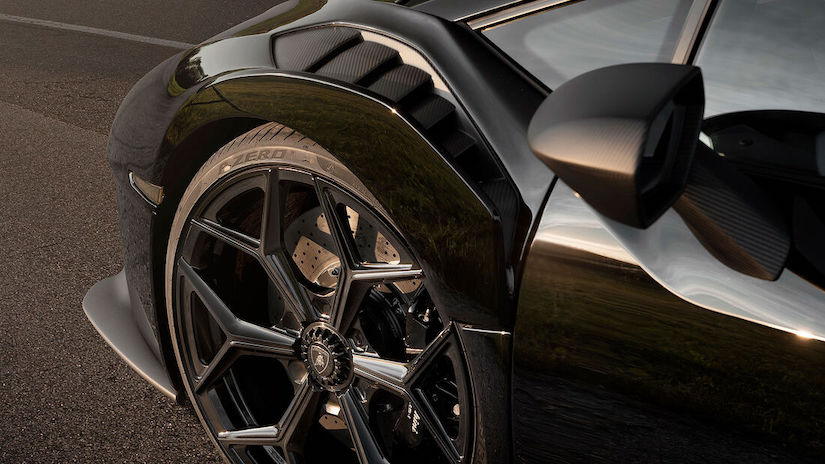 Sobre el eje delantero, el Novitec Lamborghini Huracan STO monta neumáticos de bajo perfil y muy alto rendimiento en medida 245/30 ZR 20 y de 325/25 ZR 21 para el trasero.