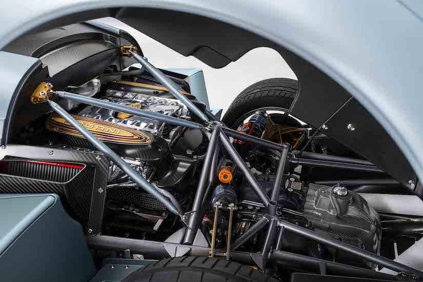 La cubierta trasera del motor ocupa más de 3,7 m2 y es 360 mm más larga que la que presentaba el Huayra Coupé, bajo la cual se esconde el Pagani V12 un propulsor que desarrolla 840 CV de potencia máxima y entrega 1.100 Nm de par máximo. Dispuesto en posición central trasera, está cubierto por una cortina de lamas que desciende desde el techo hacia la zaga y que se va estrechando a medida que esta se va alargando dando mayor espacio a la superficies planas que se crean entre esta aquella y las redondeadas y suaves formas que se crean a partir de los pasos de rueda en los laterales del coche.