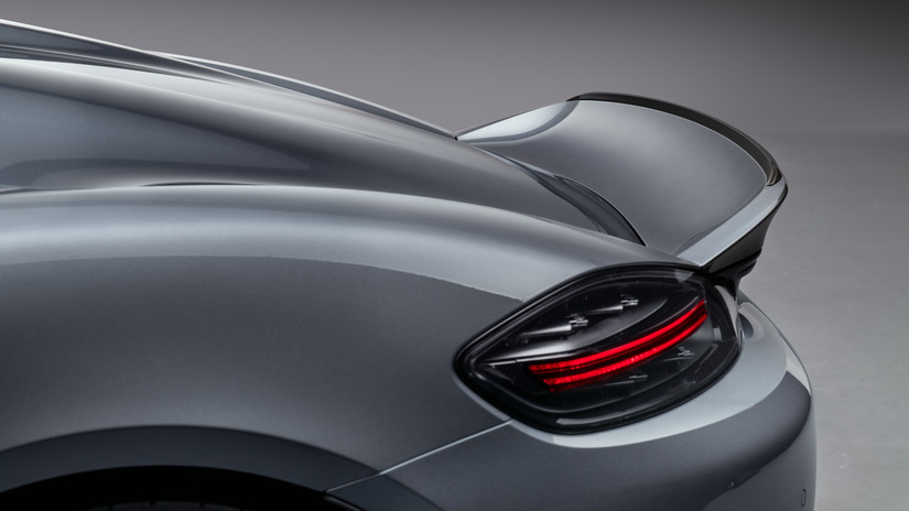 Los deflectores de los extremos del paragolpes aumentan la carga aerodinámica. El labio del alerón delantero es ligeramente más corto que en el 718 Cayman GT4 RS y, en lugar del alerón trasero fijo con brazos de cuello de cisne de este último, presenta un spoiler con forma de cola de pato. Todos los componentes relacionados con la aerodinámica están estrechamente coordinados, para mantener el equilibrio del coche y garantizar la máxima estabilidad a altas velocidades.